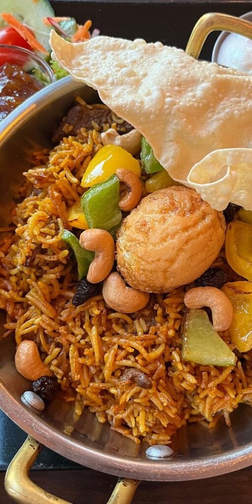 Zartes Lammfleisch mit gelbem Basmati Reis, glasierte Gemüse, geröstete Zwiebelringe, Cashewnüssen und Rosinen.